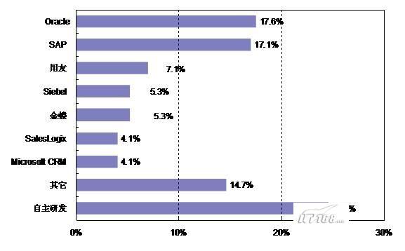 Logix(4.1%)和Microsoft CRM(4.1%)等;另有24.7%的企業(yè)是自主開發(fā)的CRM系統(tǒng)。