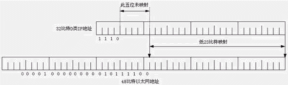 D類地址的最后28比特沒有結(jié)構(gòu)化,即沒有網(wǎng)絡ID和主機ID之分。響應某一個IP多播地址的主機構(gòu)成一個主機組,主機組可跨越多個網(wǎng)絡。主機組的成員數(shù)是動態(tài)的,主機可以通過IGMP協(xié)議加入或離開某個主機組。IP多播地址影射到以太網(wǎng)地址的方法見下圖。因為IP多播地址的高5位未影射,因此,影射的以太網(wǎng)地址不是唯一的,共有32個IP多播地址影射到一個以太網(wǎng)地址。