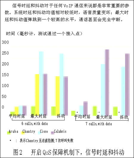 而當(dāng)我們通過一個(gè)接入點(diǎn)或交換機(jī)傳送6到7個(gè)并行VoIP呼叫時(shí),尤其是加入了數(shù)據(jù)通信業(yè)務(wù)后,所有產(chǎn)品的系統(tǒng)性能顯著降低。另外,當(dāng)開通7個(gè)并行VoIP呼叫和關(guān)閉QoS保障機(jī)制時(shí),即使沒有加入數(shù)據(jù)業(yè)務(wù), Colubris設(shè)備也幾乎都處于通話中斷的狀態(tài)。因此,我們無法得到任何測試數(shù)據(jù)(如圖1所示)。