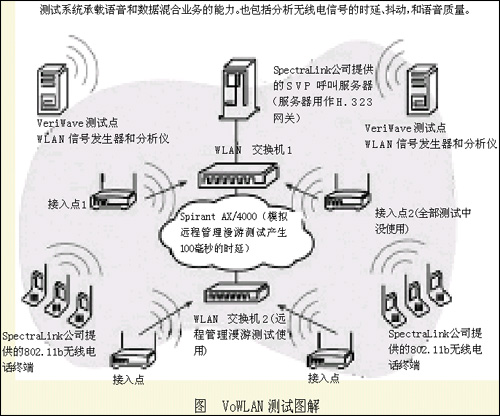這次試驗(yàn)搭建了有著自己鮮明特點(diǎn)的VoWLAN試驗(yàn)系統(tǒng)。該系統(tǒng)包括兩個(gè)802.11b接入點(diǎn)適配設(shè)備和一部連接到接入點(diǎn)的交換機(jī)以及路由設(shè)備,還有14個(gè)WLAN手持終端設(shè)備和SpectraLink公司提供的SVP呼叫服務(wù)器(服務(wù)器用做H.323網(wǎng)關(guān))。另外,VeriWave公司提供了實(shí)驗(yàn)的測試設(shè)備。我們還在漫游測試項(xiàng)目中使用了由Spirent公司提供的信號損傷發(fā)生器。