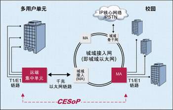 對于擁有眾多用戶的樓宇或校園業(yè)務,運營商可能需要在靠近客戶的地方裝設遠端集中器。遠端集中器集中提供給該樓宇內客戶的TDM和/或分組業(yè)務,使用電路仿真并通過點到點連接將業(yè)務傳回最近的城域網(wǎng)絡接入點。