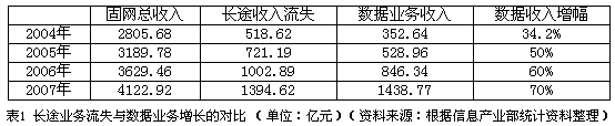 表1 長途業(yè)務(wù)流失與數(shù)據(jù)業(yè)務(wù)增長的對(duì)比 (單位:億元)(資料來源:根據(jù)信息產(chǎn)業(yè)部統(tǒng)計(jì)資料整理)