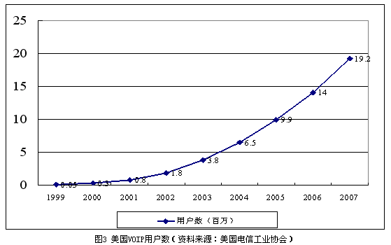 與此同時,Qwest也開始在明尼蘇達州提供類似的VoIP業(yè)務(wù),并計劃在近期內(nèi)推向全國。Verizon與北電網(wǎng)絡(luò)簽訂了大筆的訂單,計劃全面改造其本地電話網(wǎng)絡(luò)提供的VoIP業(yè)務(wù)。一些曾經(jīng)著名的網(wǎng)絡(luò)電話公司(如Net2Phone)也開始進入傳統(tǒng)電話市場。截止到2004年2月底,Vonage的全IP網(wǎng)絡(luò)已經(jīng)擁有13萬VoIP用戶。據(jù)美國電信工業(yè)協(xié)會預(yù)測,到2007年年末,全美的VoIP用戶將會達到1920萬戶,如圖3所示。