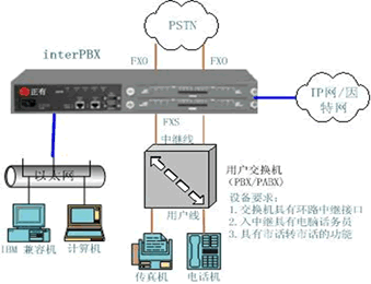 根據(jù)電話交換機(jī)的配置和功能不同,電話交換機(jī)與 interPBX設(shè)備的連接方式有二種常見(jiàn)方式,下面結(jié)合示意圖來(lái)具體說(shuō)明。