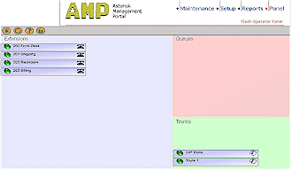 在AMP中,有四個(gè)主要的部分――維護(hù)、設(shè)置、報(bào)告和面板。我們還沒(méi)開(kāi)始進(jìn)行設(shè)置呢,則設(shè)置標(biāo)簽是我們要最先來(lái)訪(fǎng)問(wèn)的,它的主要功能是維護(hù)管理呼入和呼出,包括設(shè)置中繼、數(shù)字話(huà)務(wù)員、語(yǔ)音信箱,甚至還可處理響鈴后播放的音樂(lè)(類(lèi)似于現(xiàn)在手機(jī)上的彩鈴噢)。