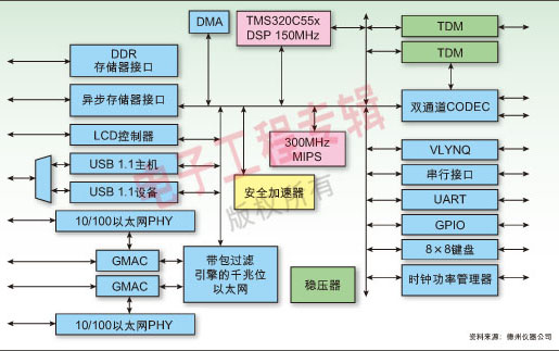 德州儀器(TI)公司最新的VoIP處理器設計用于確保在中小企業(yè)應用中提供無延遲的語音服務。這種名為TNETV1051的處理器集成了1個300MHz的MIPS處理器、1個150MHz的C55x數(shù)字信號處理器(DSP)、2個千兆位以太網(wǎng)(GbE)媒體訪問控制器(MAC),以及1個片內(nèi)GbE交換器。