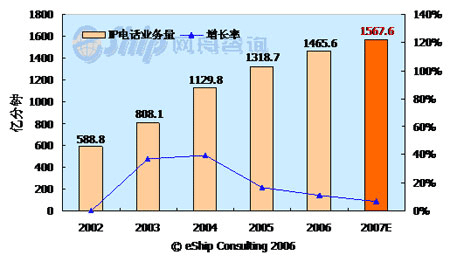 從圖中可以看出,國內(nèi)IP電話市場近年呈現(xiàn)出快速增長趨勢(shì),2002-2007年年均增長率為20.7%。預(yù)計(jì)2007年IP電話的通話時(shí)長將達(dá)到1567.6億分鐘,同比增長7%。但從2005年開始,IP電話的增長率呈下降趨勢(shì),這主要是受管制限制和移動(dòng)長途的替代作用所致。