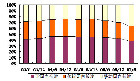 從圖中可以看出,IP電話的相對(duì)快速增長在一定程度上對(duì)傳統(tǒng)長途電話形成了替代作用,但近年來自于移動(dòng)長途的替代作用更明顯。從占比上來看,2007年上半年,IP國內(nèi)長途電話占全部國內(nèi)長途通話量38.3%,超過移動(dòng)長途電話的35.9%和傳統(tǒng)長途電話的25.8%,仍然是長途電話的主流。