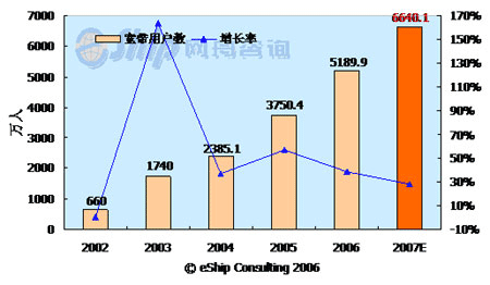 從圖中可以看出,中國的寬帶用戶數(shù)保持了快速的發(fā)展勢(shì)頭,從2002-2007年年均增長率為58.7%,至2007年,國內(nèi)的寬帶用戶數(shù)將達(dá)到6640.1萬。