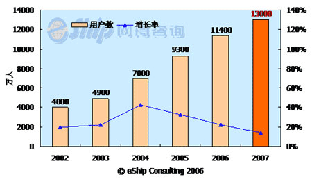 從圖中可以看出,國內(nèi)即時(shí)通訊用戶數(shù)保持了較快的發(fā)展速度,從2002-2006年年均增長率為26.6%,到2007年國內(nèi)即時(shí)通訊用戶數(shù)將達(dá)到1.3億。
